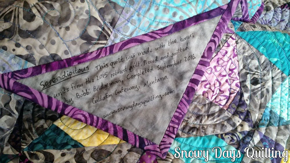 I named the quilt Serendipitous since it came from Missouri Star's Serendipity pattern. The name fits, because the start of our friendship was certainly serendipitous. I used the same binding fabric as Joy's quilt, which just completes the feeling that they're two peas in a pod. Kind of like us.
